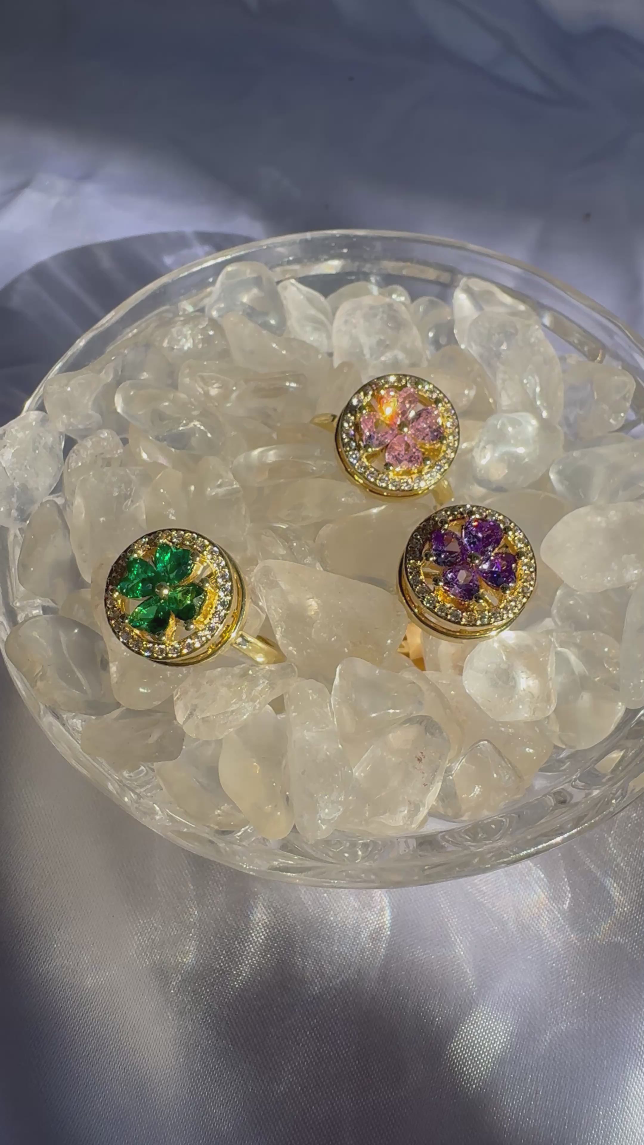 Adjustable gold plated fidget ring with clear and purple zircon gems.
